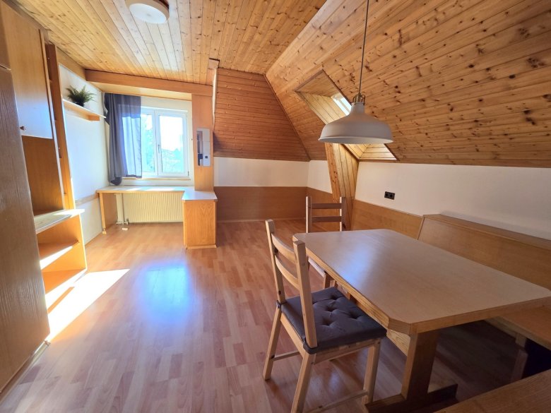 Überaus helle, freundliche Dachgeschoßwohnung im 2. und gleichzeitig letzten Obergeschoß (kein Nachbar oberhalb); beliebte Wohngegend Nähe FH-Joanneum und Schlosspark Eggenberg - angrenzend an eine liebevoll gepflegte Heimgartenanlage; ruhige Sackgasse mit guter Infrastruktur und GVB-Anbindung; idyllischer, großer Allgemeingarten zum Mitbenützen (z. B. Hochbeet, Gemüsebeet, Blumenbeet möglich); Zimmer einzeln begehbar - bei Bedarf ideale WG-Eignung; Wohn- Essbereich + Schlafzimmer; eingerichtete Küche mit Geschirrspüler, Ceranfeld-Herd, Kühlschrank sowie Frühstücksplatz ausgestattet; Badezimmer mit Wanne und Fenster; Toilette mit Fenster vom Bad getrennt; Diese Wohnung ist voll möbliert (auf Wunsch können vermieterseits einzelne Möbel entfernt und die Decken weiß gestrichen werden); Miete bereits inklusive Betriebs- und Heizkosten + 25,-- Möbelmiete; Sofortbezug möglich.