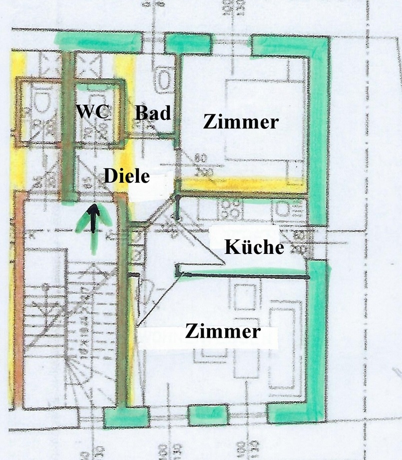 Günstige, einfache 2-Zimmer-Wohnung; zentrale Stadtlage - Seitengasse mit guter Infrastruktur und GVB -Anbindung nächst Citypark und Oeverseepark; 8 Radminuten zum Bauernmarkt am Lendplatz; 10 Radminuten zum Hauptplatz sowie zur FH-Joanneum; 12 Radminuten zur KF-Universität; durchdachte Raumeinteilung; Zimmer einzeln begehbar - daher ideale Eignung für 2er-WG; Diele mit Platz für Garderobe; abgeschlossene Küche mit älterem Küchenblock; Badezimmer mit Dusche, Fenster sowie Waschmaschinen-Anschluss ausgestattet; Toilette vom Bad getrennt; Massivparkettböden; weiße Innentüren; Fenster Kunststoff-Isolierverglasung mit Rolläden; Kellerabteil; Baujahr 1965; kein Balkon; Zum Parken stehen Ihnen Stellplätze in der umliegenden Zone ab 16,- monatlich zur Verfügung; Kaufpreis € 84.000,-- + € 16.300,-- Haus-Sanierungsdarlehen (= mtl. 120,--) für die bereits erfolgte thermische Sanierung des Hauses (Vollwärmeschutz-Fassade + Isolierglasfenster/Rolläden); Die Wohnung gehört aufgehübscht (reinigen, Küchenblock erneuern, Parkett schleifen, ausmalen).